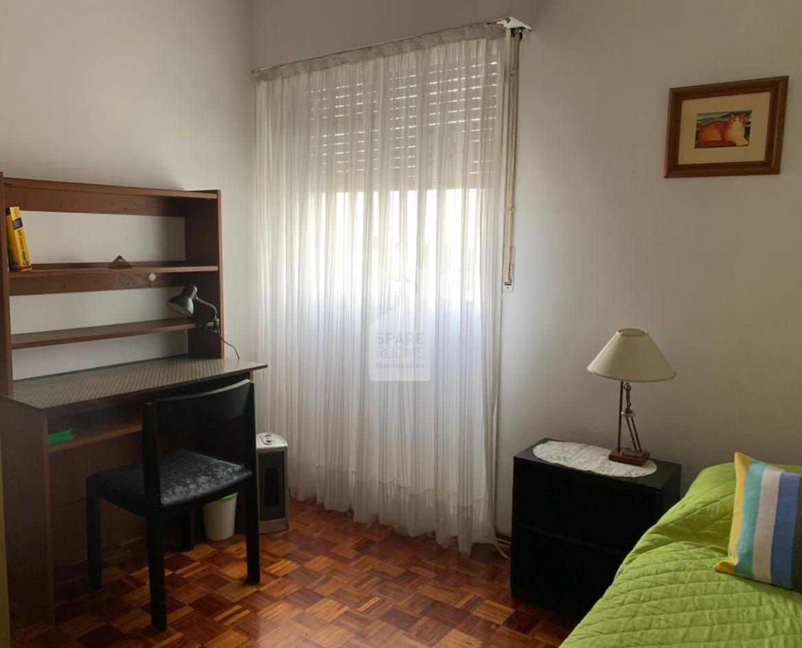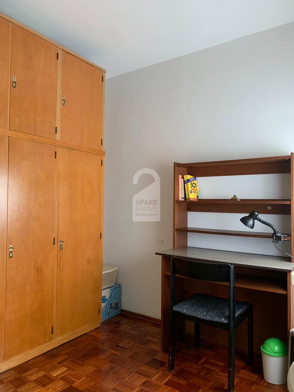 Esta linda y cómoda habitación privada tiene una cama single, una mesita de luz, un amplio placard y un escritorio con biblioteca.