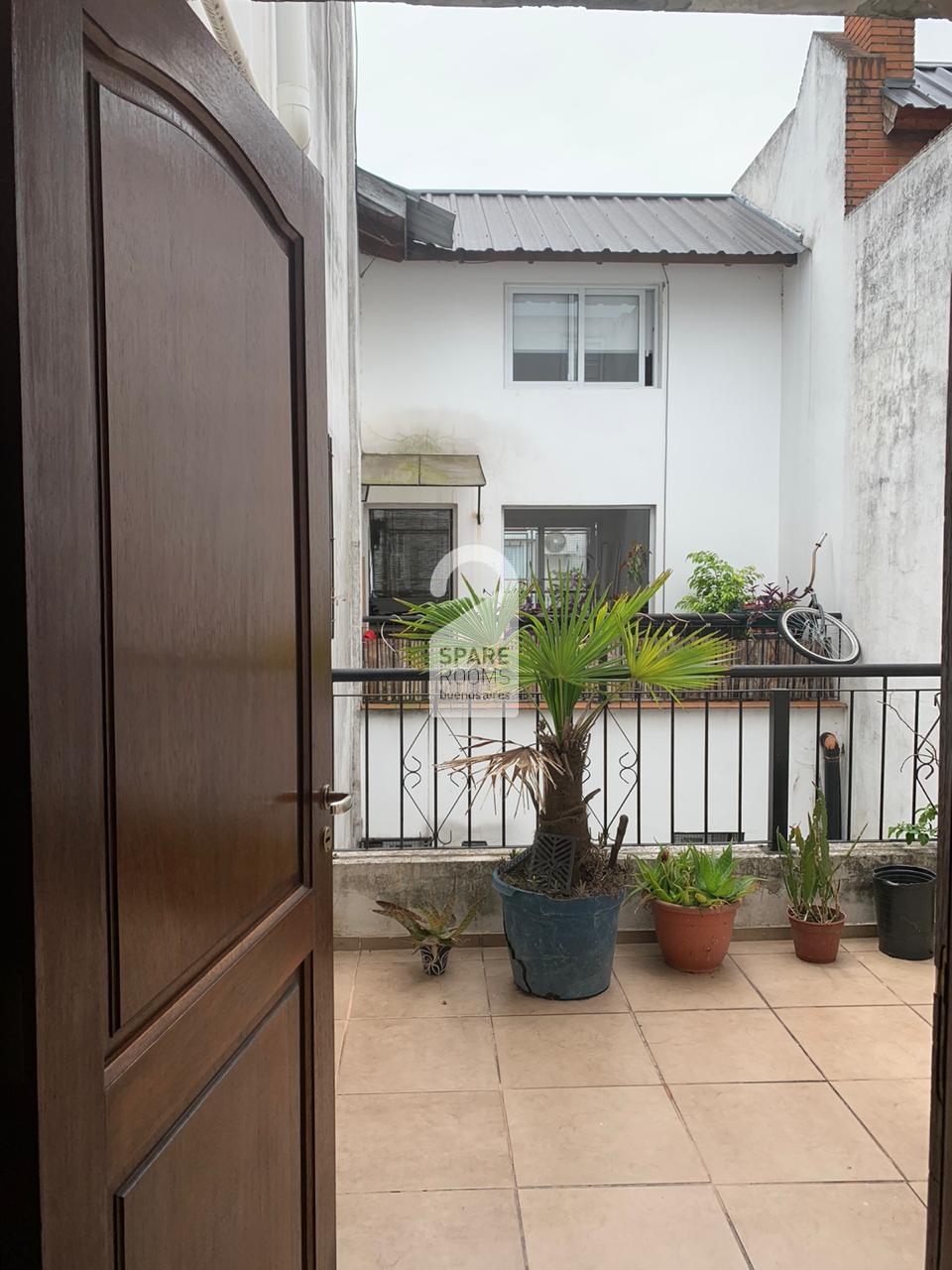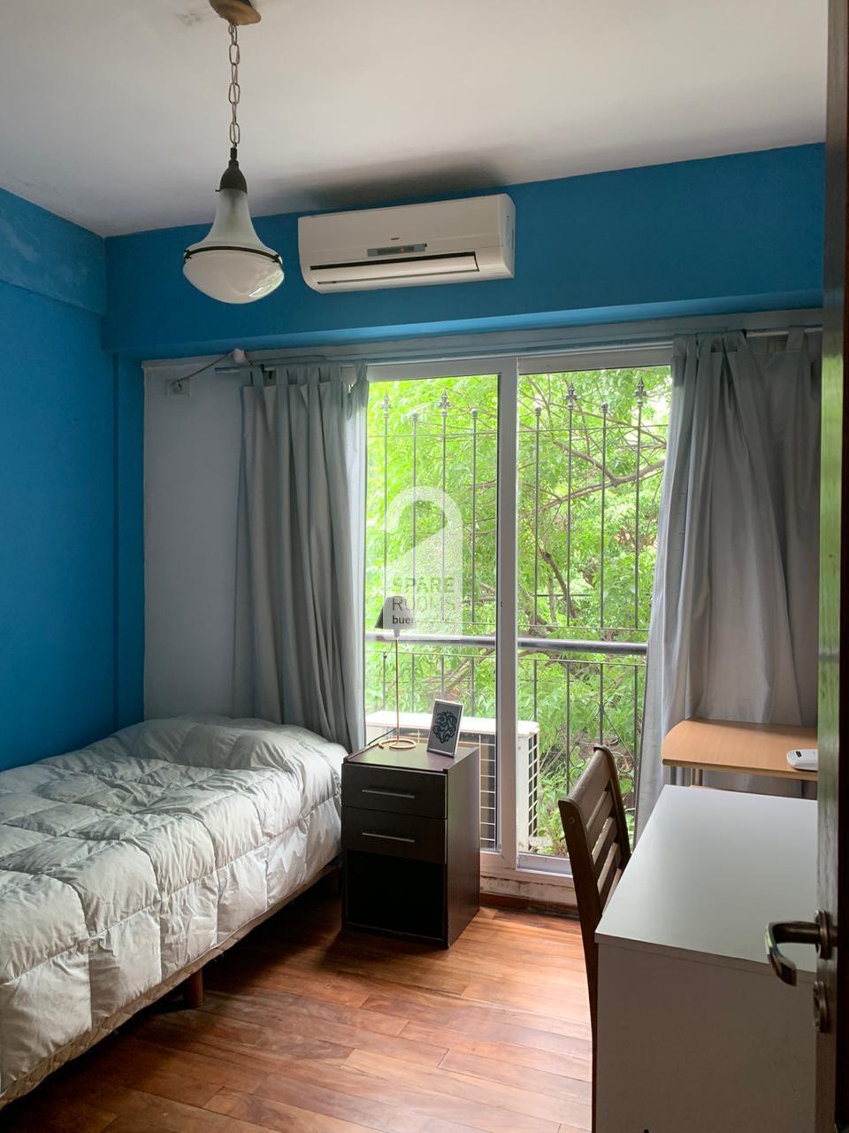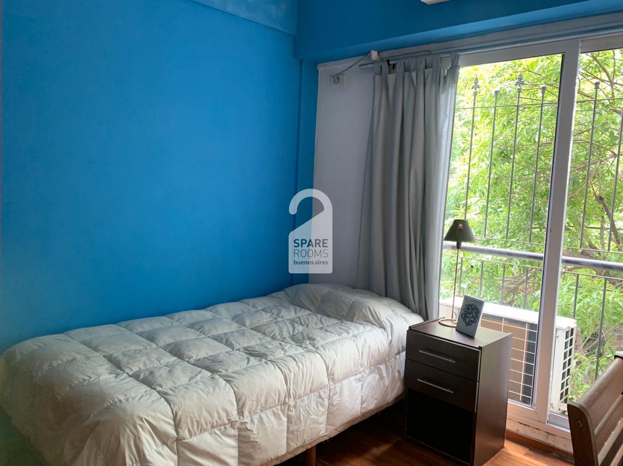 La habitación da al frente y tiene un gran ventanal con vista a los árboles de la calle que deja entrar luz natural durante el día.