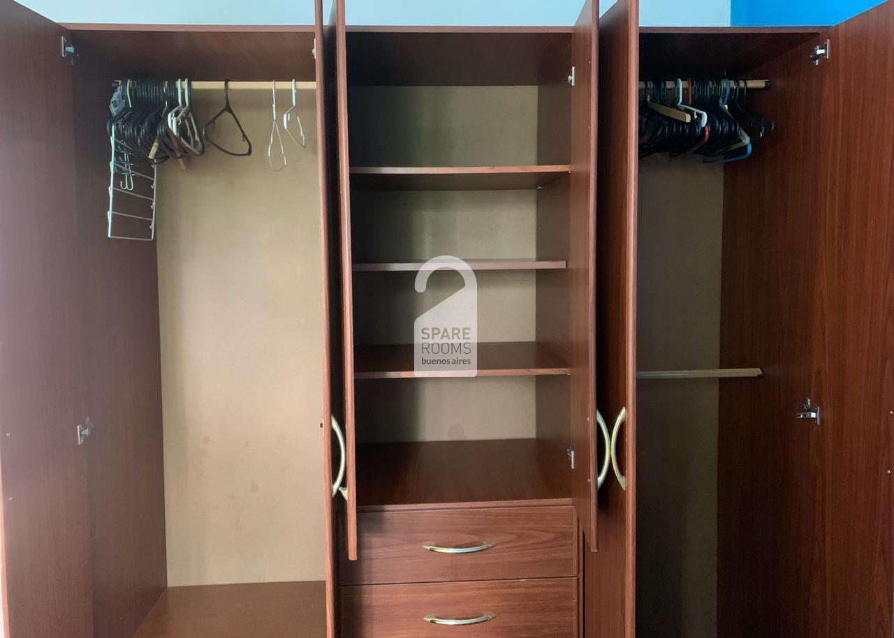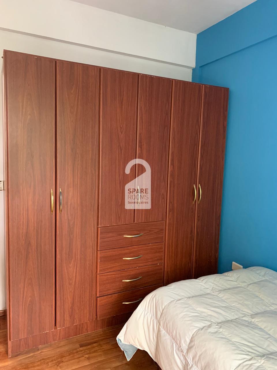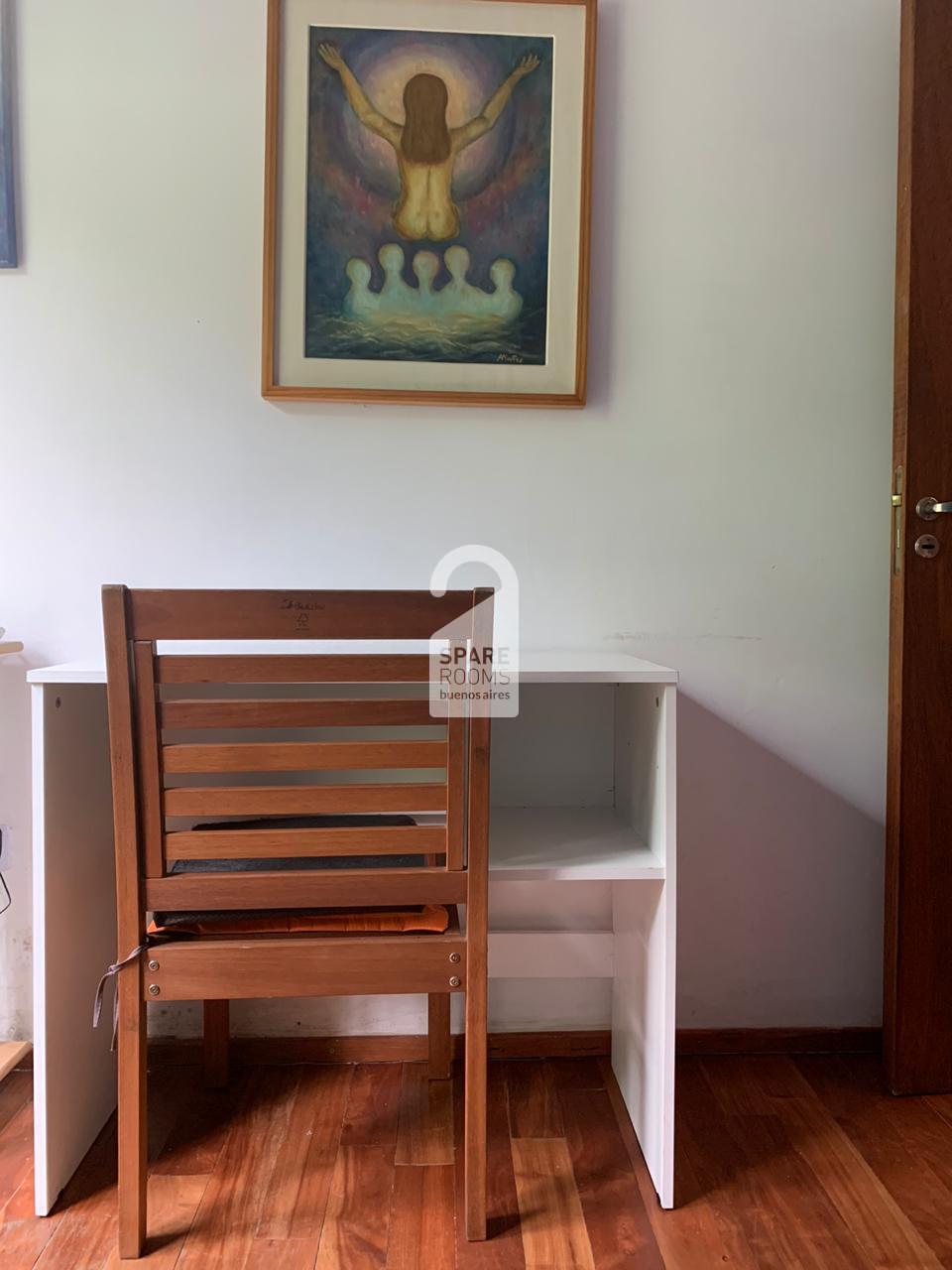 Es una habitación muy agradable y luminosa. Tiene un confortable sommier de una plaza con mesa de luz y velador, un escritorio con su silla y lámpara, ideal para que puedas trabajar o estudiar y un placard muy grande con estantes, cajones y espacio para colgar y guardar tus cosas.