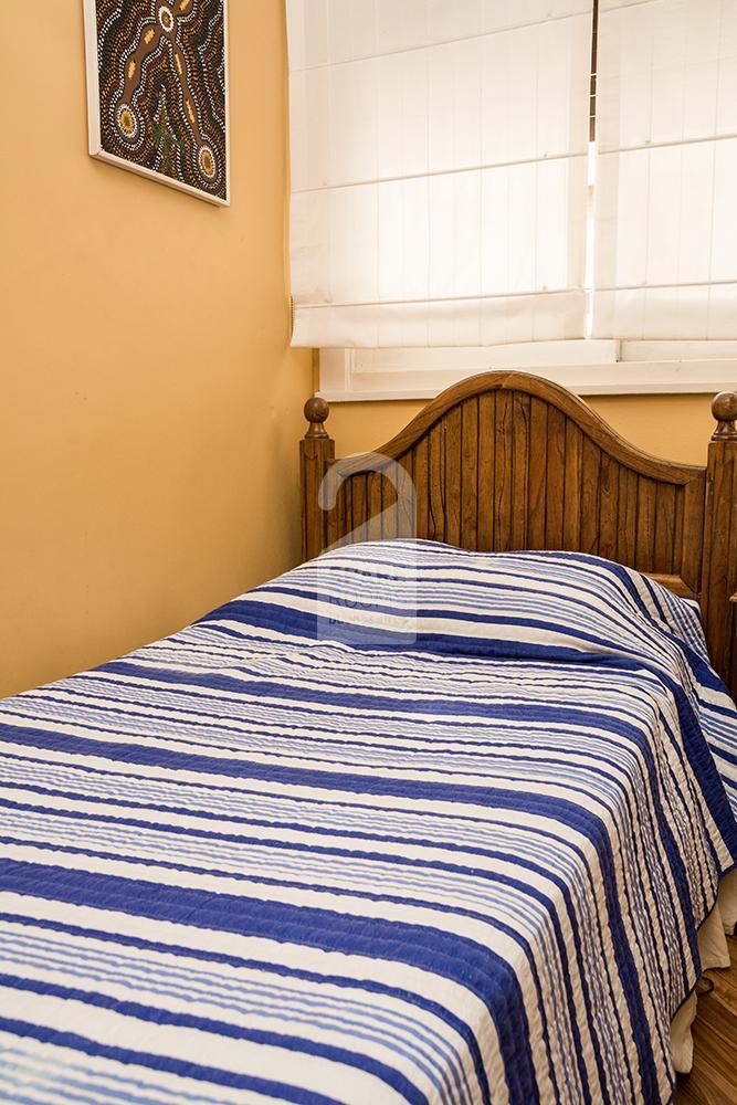 La habitación tiene una cama single, una mesa de luz con su velador y un placard.
