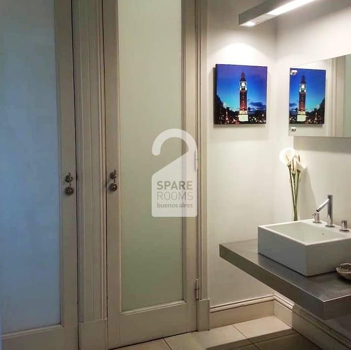 El baño se comparte con un huésped más, y cuenta con una cómoda y moderna ducha, lavamanos y un W.C. En él también hay un lavarropas, que está a tu disposición.