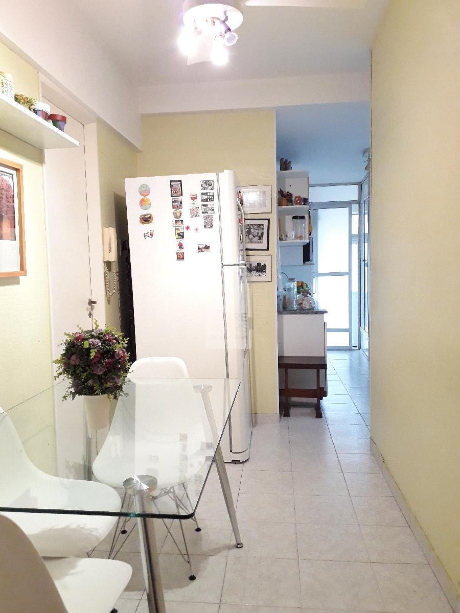 El departamento tiene un living amplio y luminoso, que cuenta con un sofá, dos sillones, una TV con cable, reproductor de DVD y una mesa pequeña.