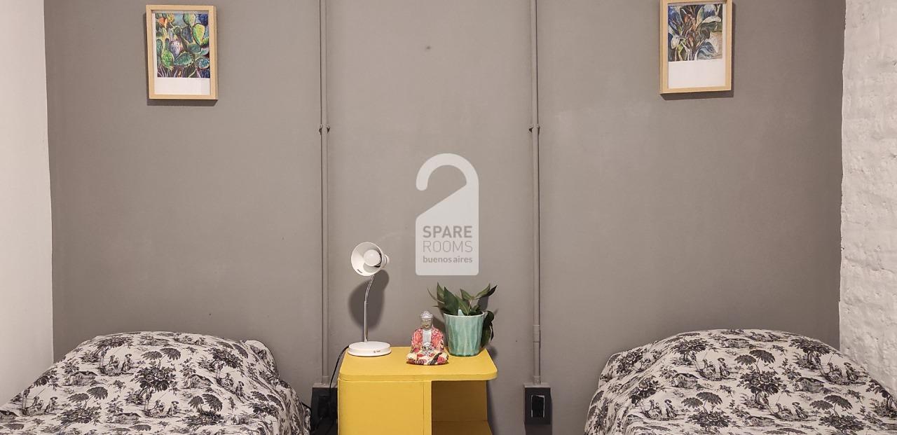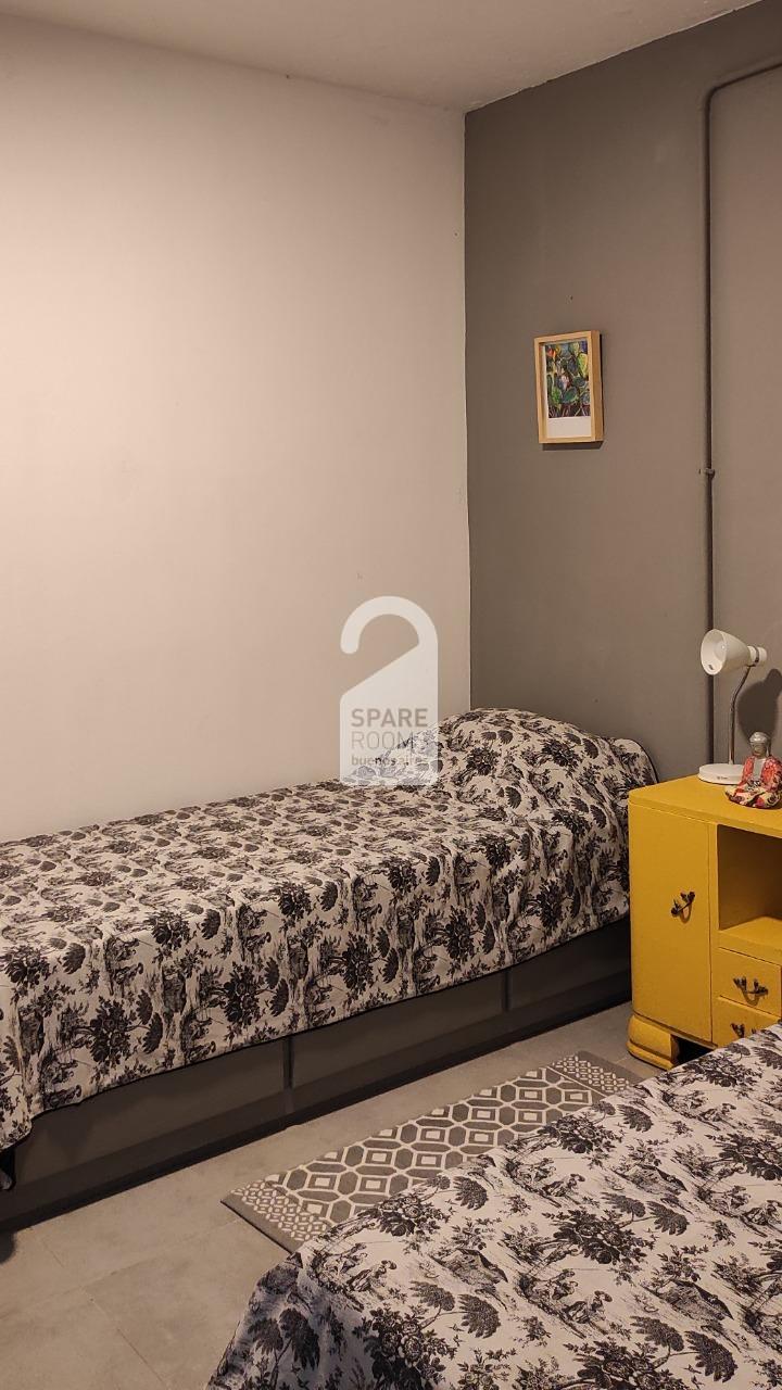 La habitación está en planta baja y es para una persona. Tiene 2 camas individuales con colchones nuevos de alta densidad para que descanses de la mejor manera. Está equipada con todo lo que podés necesitar: una mesa de luz, un placard espacioso y un escritorio con sillas frente a un ventanal que deja entrar mucha luz para que puedas leer o estudiar en un lugar cómodo.