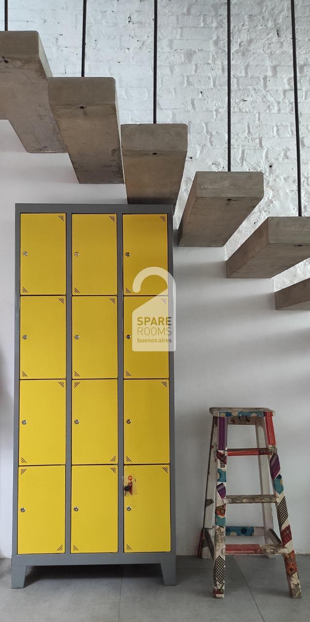 La sala de estar es un espacio muy cómodo con un sillón para que descanses, una barra y taburetes para que puedas desayunar y un armario de lockers para guardar lo que vos quieras.
