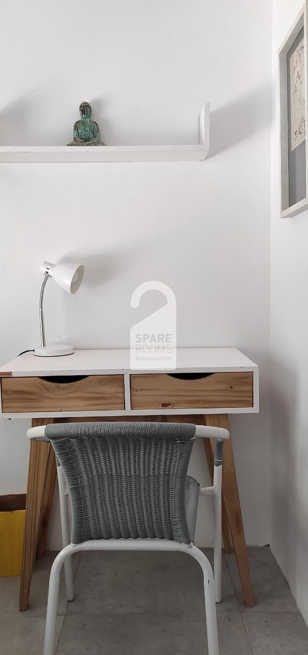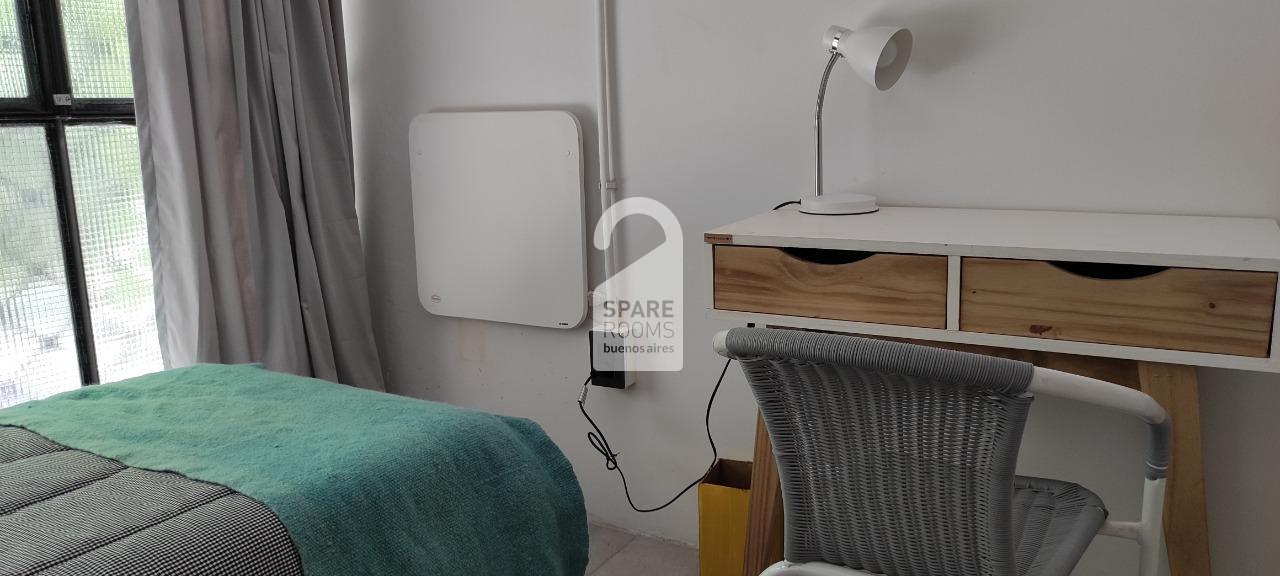 La habitación está en planta alta y es para una sola persona. Cuenta con una cama de una plaza y media con colchón nuevo de alta densidad para que duermas bien cómodo. Al lado de la cama tiene una mesa de luz y frente a ella un escritorio con silla para tengas tu espacio de estudio organizado.