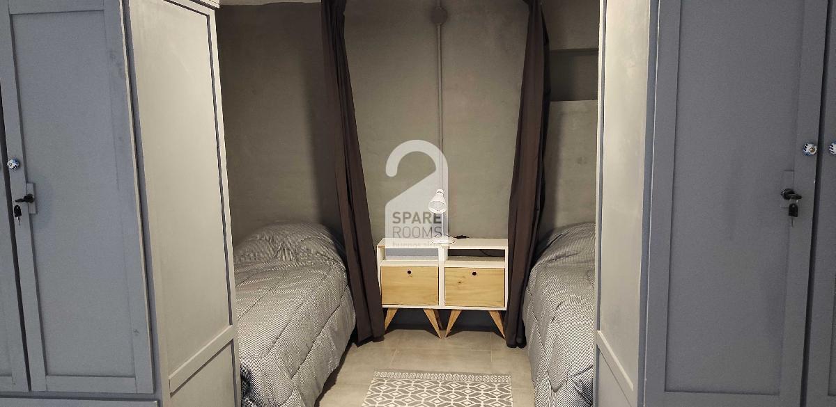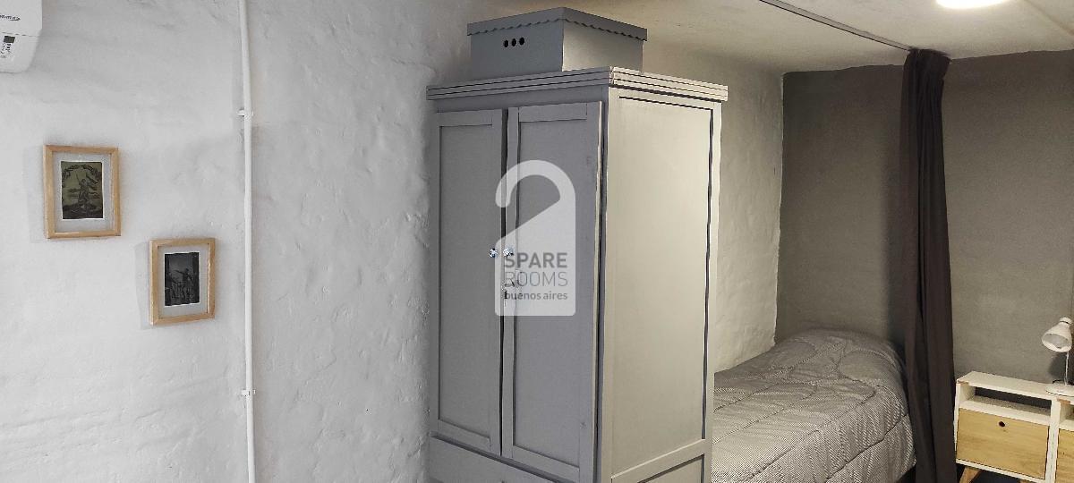 La habitación está en planta alta y es para una sola persona. Cuenta con dos camas individuales con colchones nuevos de una plaza y media para que duermas de la mejor manera. Tiene dos mesas de luz, dos placards grandes (uno para cada cama) y una mesa grande con dos sillas para que tengas tu espacio de lectura o estudio bien organizado. Las camas tienen cajones debajo para que tengas espacio extra de guardado.