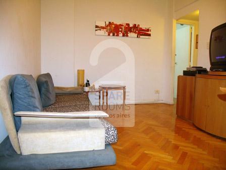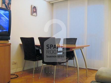 Habitación individual con baño compartido para alquilar en un departamento de Nuñez. El departamento tiene un living-comedor amueblado con un sillón, que cuenta con un sillón, TV con cable, dos mesas pequeñas y una mesa con cuatro sillas.
