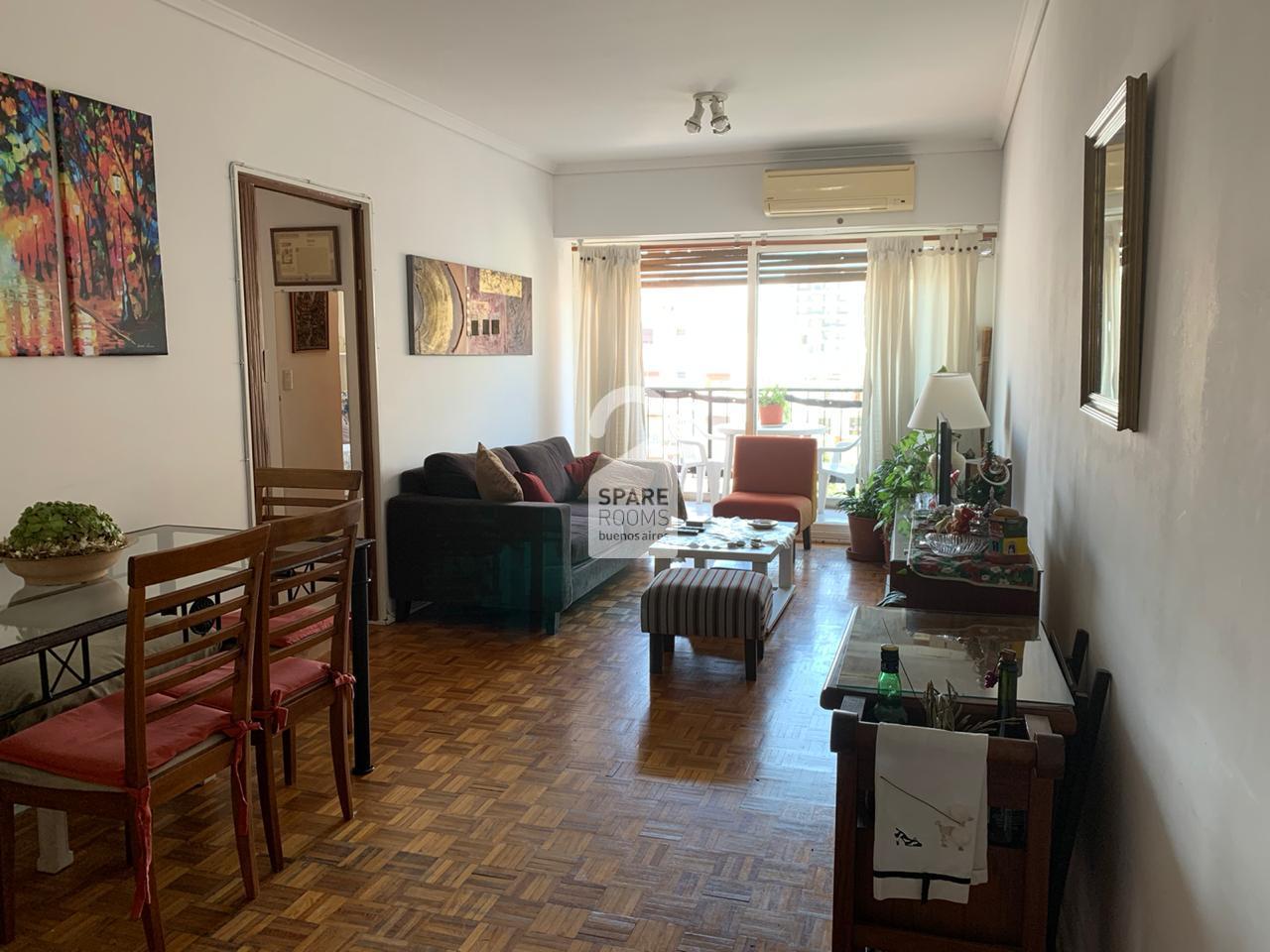 Es un departamento alegre y luminoso. Al entrar vas a encontrar el comedor con una mesa para seis personas y a continuación esta el living con un amplio y cómodo sillón frente a una TV para poder disfrutar de alguna buena película. Tiene un gran ventanal que conecta con el balcón que deja entrar mucha luz al ambiente. En el balcón hay una mesa y sillas para que puedas disfrutar de una vista abierta a jardines y comer a cielo abierto.