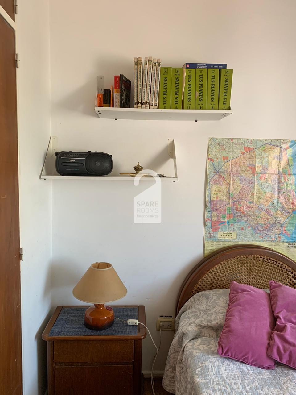 Vas a tener a tu disposición un gran placard con mucho espacio para guardar tus cosas y estantes para guardar libros.