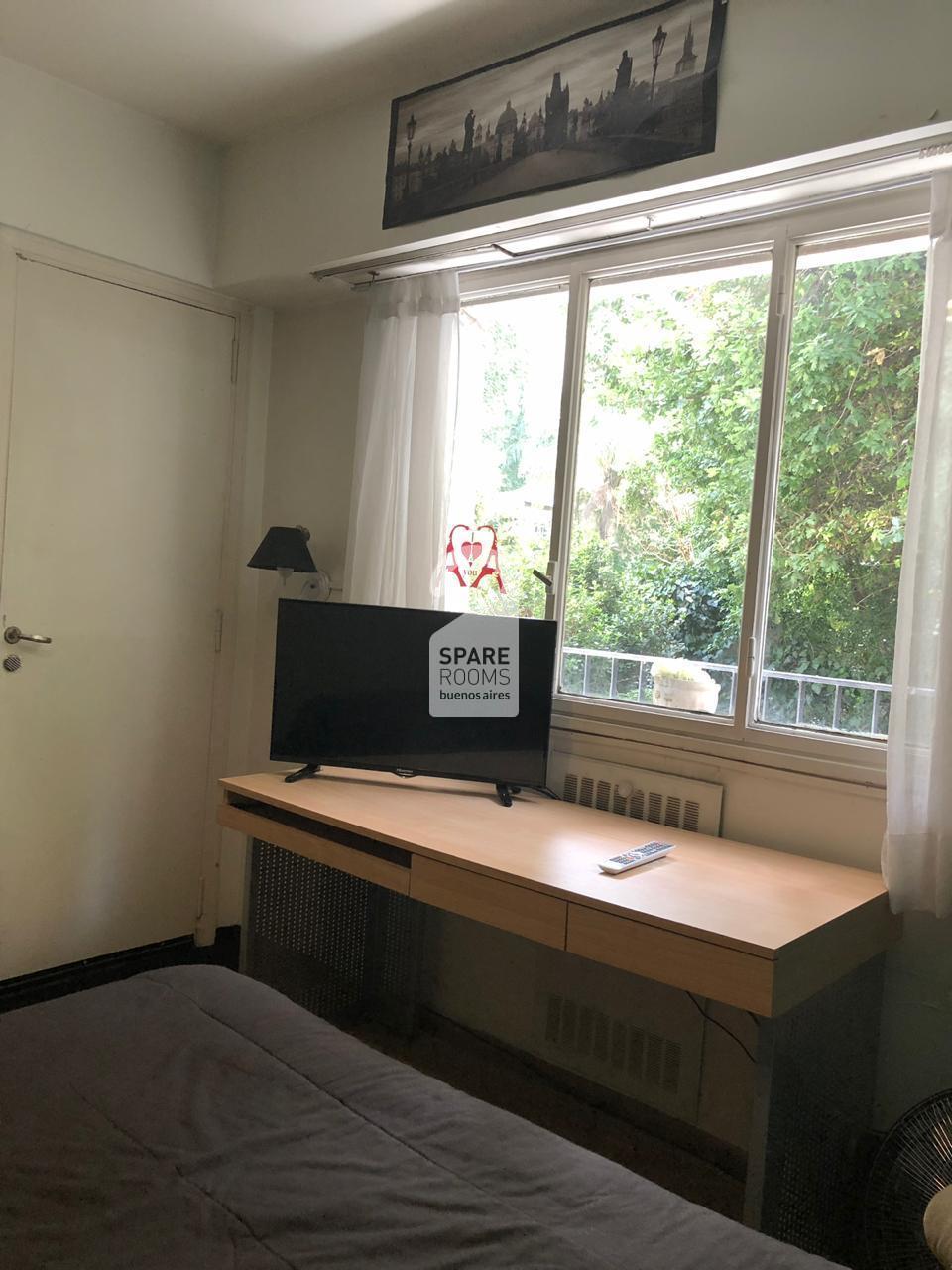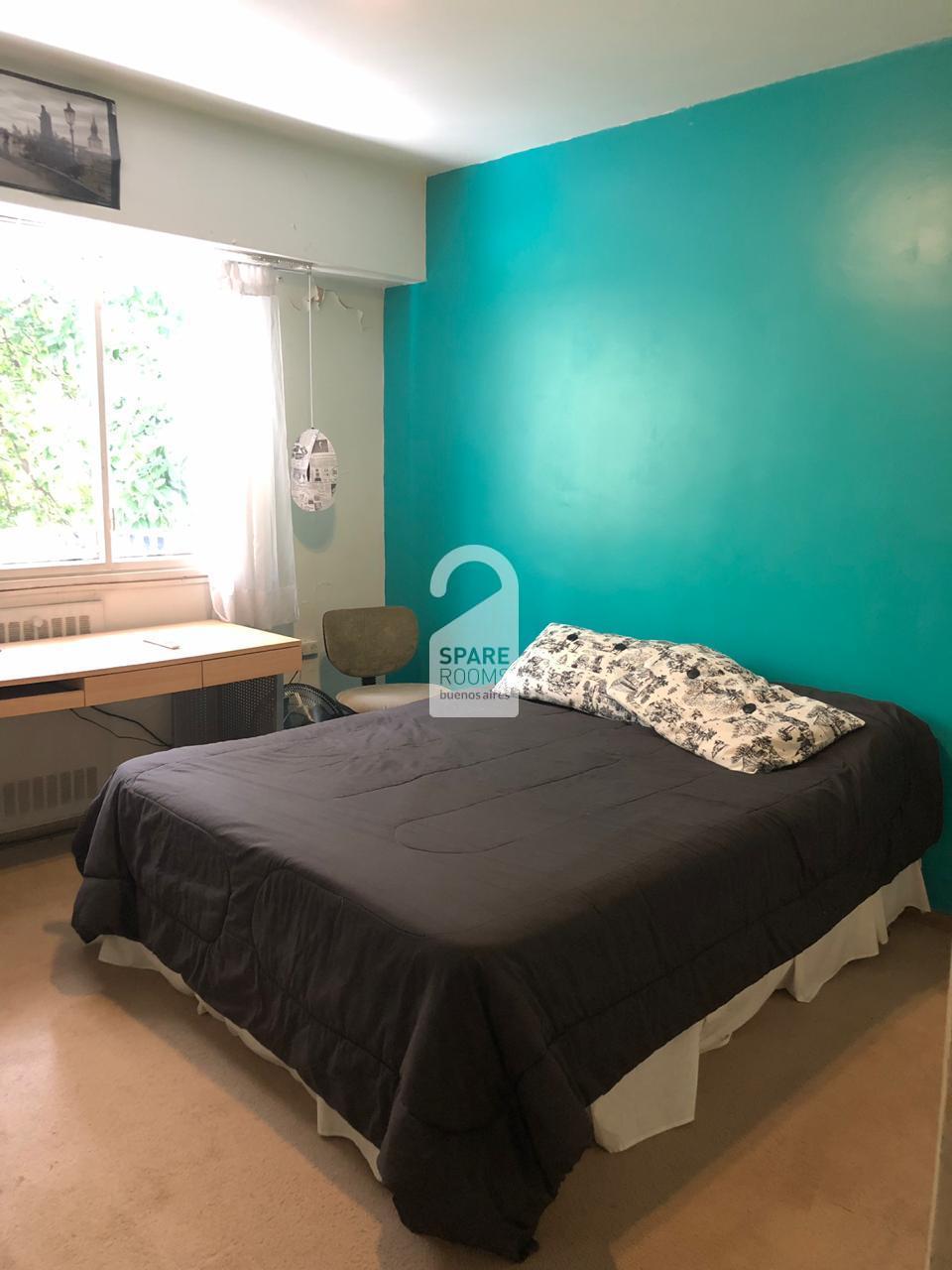 Esta hermosa habitación cuenta con una cama doble para dos personas, un gran escritorio, silla, TV, ventilador y calefaccion y cómodo y amplio placard. Tiene vista al jardín con muchísima luz y es sumamente silenciosa, ideal para estudiar o trabajar.
