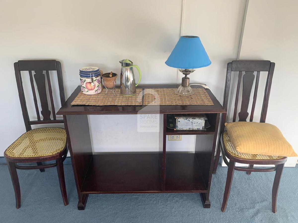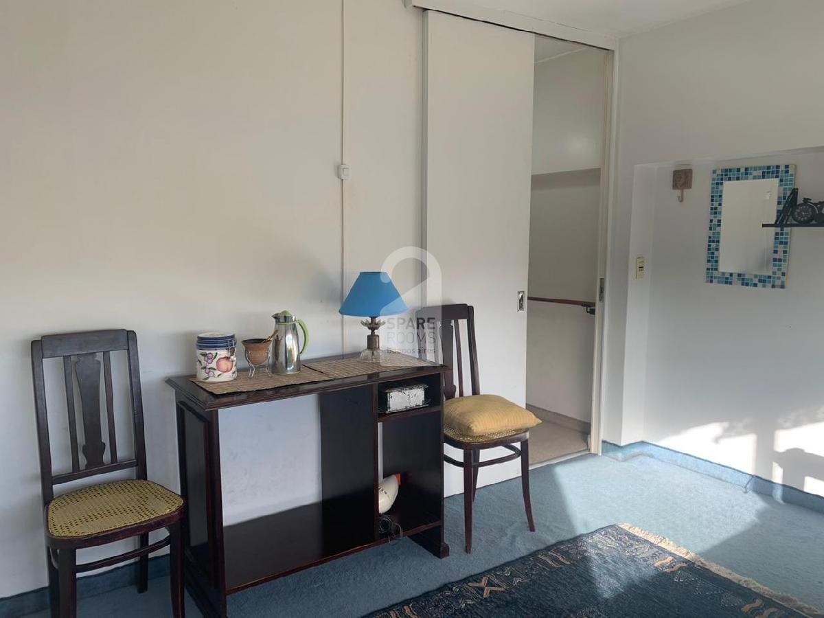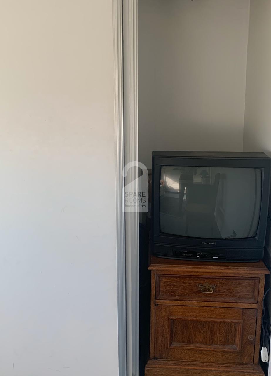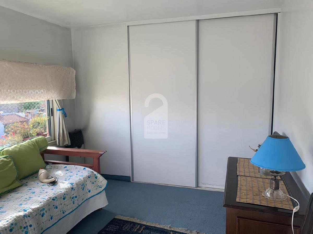 La habitación esta en el segundo piso del dúplex. Es muy agradable y luminosa.  Tiene una confortable cama de una plaza con colchón nuevo, un mesa que se puede usar de escritorio con dos sillas y una lámpara. Tiene un amplio placard con estantes y cajones. Hay también una TV a tu disposición.