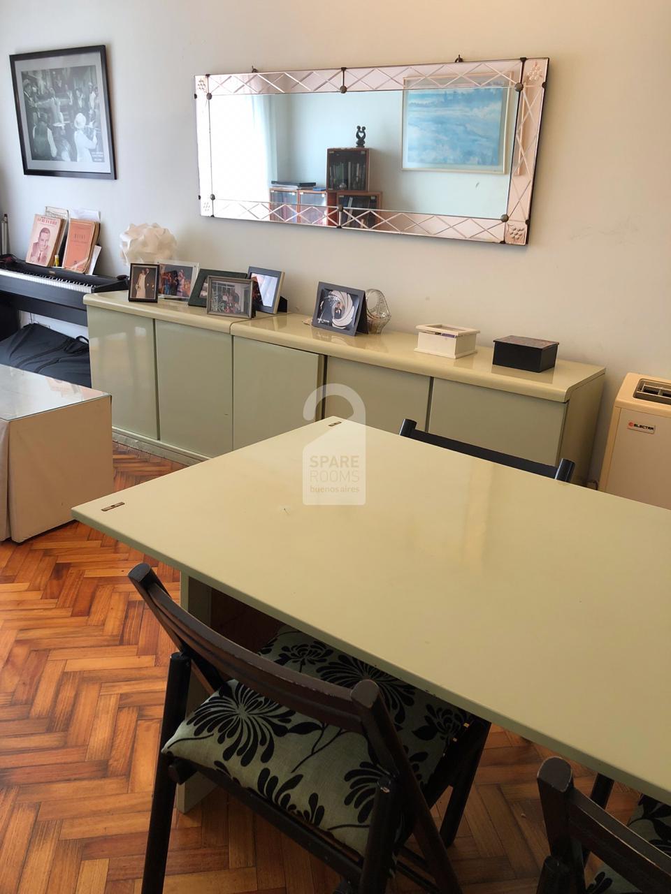 El departamento tiene un living, que cuenta con un sillones, un piano, guitarra, equipo de música y un modular. El comedor esta integrado a este ambiente y tiene una mesa con cuatro sillas.