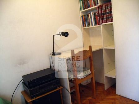 La habitación privada tiene una cama single, bibliotecas, placard, un escritorio con silla, un equipo de música y TV con cable.