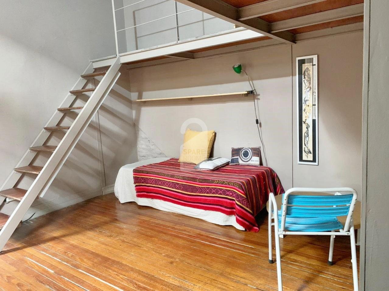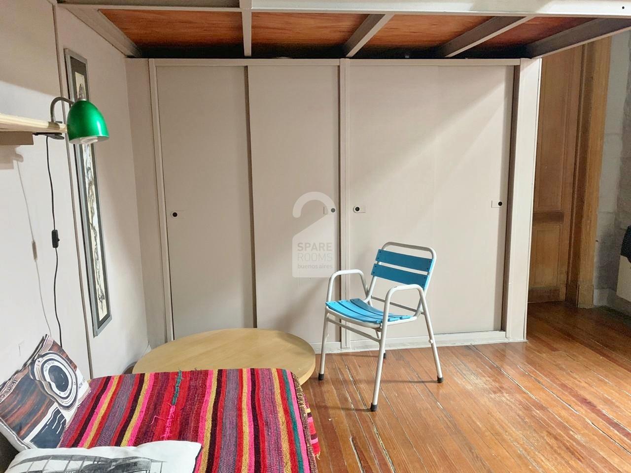 Es una habitación muy amplia y luminosa con un entrepiso en donde se encuentra la cama de dos plazas con una mesa de luz y velador. Abajo esta pensado como una sala de estar, hay otra cama individual que se usa como diván, una mesa con silla y un gran placard. Tiene una puerta ventana que conecta con el patio y deja entrar mucha luz dándole mucha calidez.