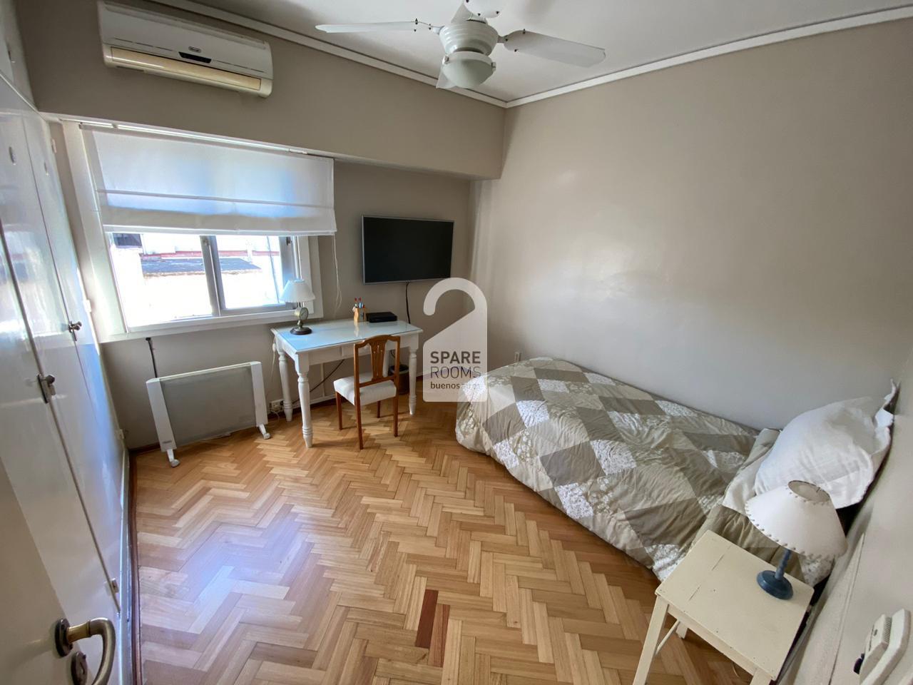 Es una habitación luminosa y muy funcional, tiene una cama de una plaza con un velador para la noche, un escritorio con muchos estantes para guardar tus cosas, su silla y lámpara para que puedas trabajar o estudiar y cuenta con su propia TV.