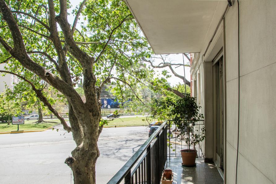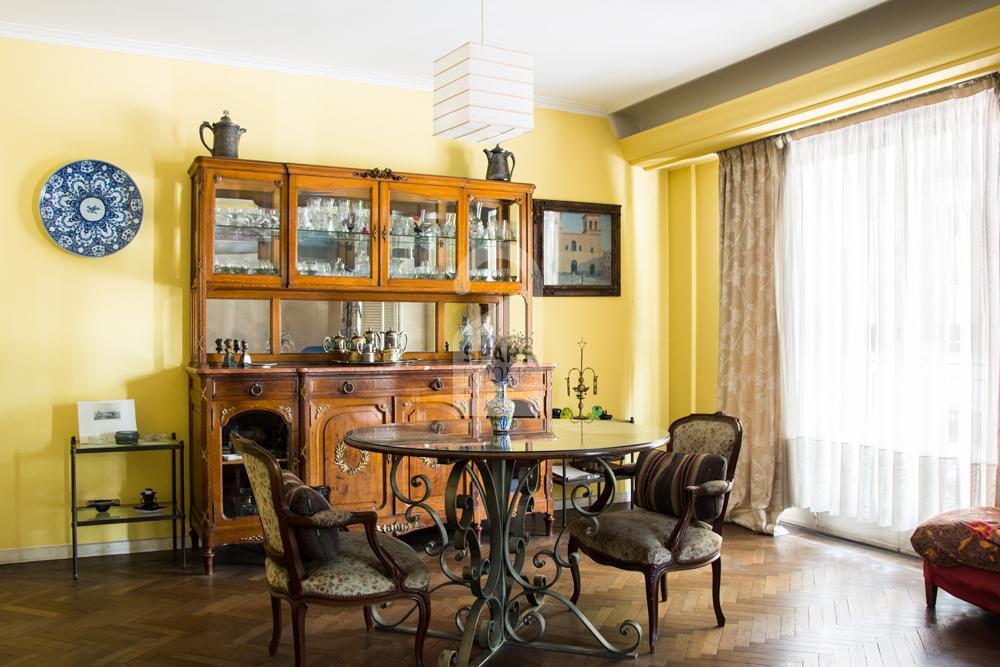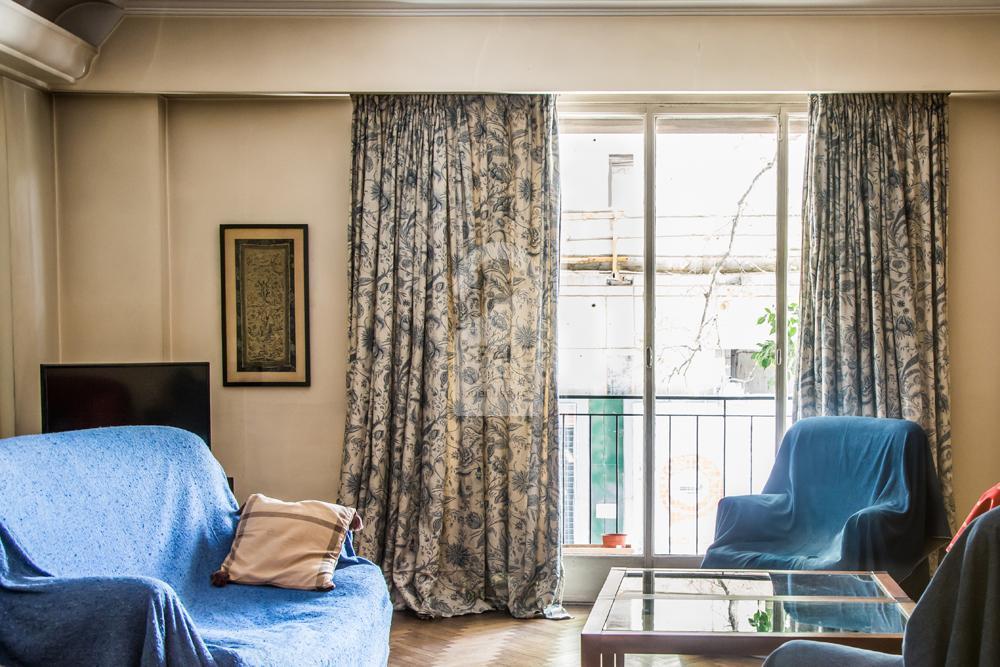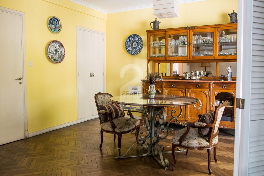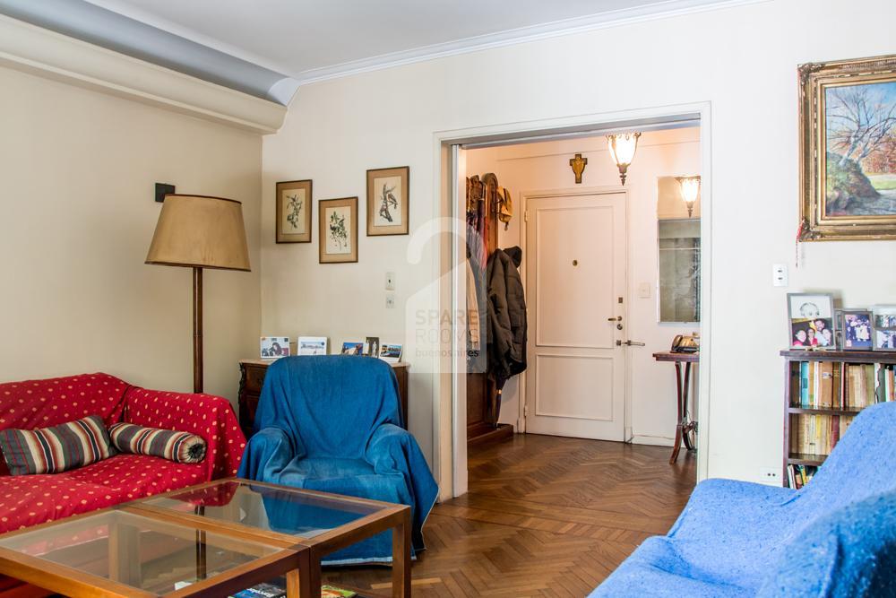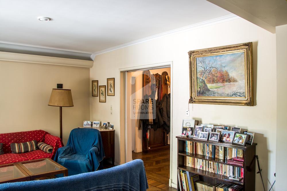 El departamento tiene un living, que cuenta con varios sillones, una TV con cable y una mesa ratona. El comedor está en otro ambiente y tiene una mesa redonda de hierro con 4 sillas y un espectacular cristalero antiguo.