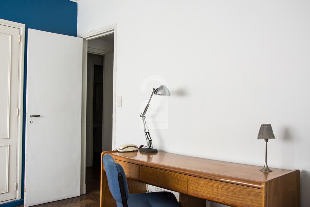 La habitación tiene una cama single con un colchón muy cómodo, una mesa de luz con su velador, un puff, un placard de pared a pared, y un escritorio ideal para trabajar o estudiar.