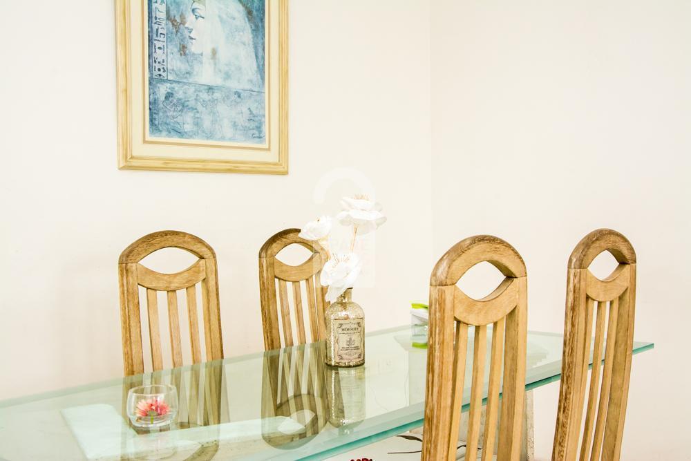 In the dining room you can see also a big glassy and granite table with its four flowered covered chairs.