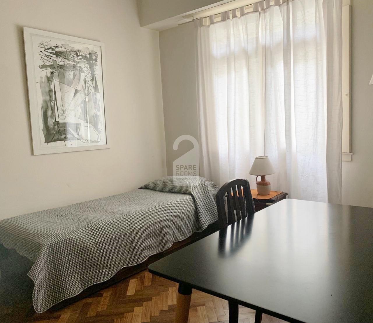 This huge and charming bedroom has a single bed, a desk with a chair and a lamp to study or work, a closet and a furniture with shelves and a nice mirror.