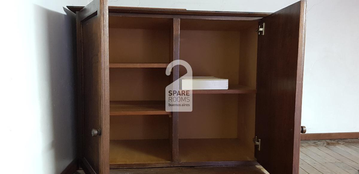 It has a mezzanine (where there is another single bed) and a closet with shelves to store your things. There is also a bookshelf with several shelves at your disposal.